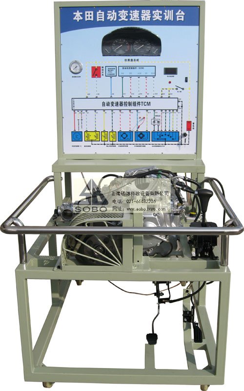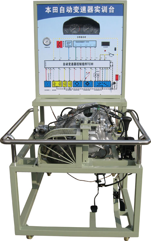 本自動變速器實訓(xùn)臺是本公司采用日本本田公司自動變速器為適應(yīng)汽車教學(xué)需求而研制的,該實訓(xùn)臺由電控變速器(八成新)、操作顯示面板及發(fā)動機彩色電氣原理圖電腦控制柜、可移動式臺架(萬向腳輪)、驅(qū)動系統(tǒng)(腳踏式油門踏板)變頻電機驅(qū)動、剎車系統(tǒng)(腳踏液壓盤試剎車)、啟動系統(tǒng)(電門鎖方式啟動)、車速傳感器、電磁閥執(zhí)行器、原車電腦、具有發(fā)動機運轉(zhuǎn)及顯示(轉(zhuǎn)速.車速.檔位)、液壓油壓力顯示表(顯示換檔過程油壓)、自動變速器電磁閥工作指示LED燈、原車診斷座、進行失速實驗等、故障設(shè)置區(qū)可設(shè)置8路故障(老師設(shè)置任一路線路故障)、故障排除區(qū)(學(xué)生通過各種儀器、儀表、)在面板上用專用排故線連接排除故障、傳感器信號模擬等多項功能、具結(jié)構(gòu)緊湊、操作方便、安全可靠、教學(xué)直觀、是汽車自動變速器實物教學(xué)不可缺少的實驗室設(shè)備之一。