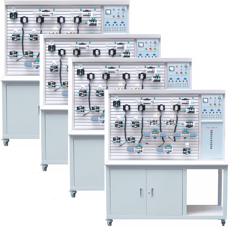 透明液壓實(shí)驗(yàn)臺(tái)為實(shí)現(xiàn)液壓傳動(dòng)課程現(xiàn)代化教學(xué)而進(jìn)行研究的最新科技成果,它填補(bǔ)了技校、中專(zhuān)、大專(zhuān)院校的液壓傳動(dòng)透明教學(xué)設(shè)備的國(guó)家空白。液壓傳動(dòng)具有重量輕、功率大、結(jié)構(gòu)簡(jiǎn)單、布局靈活、控制方便等特點(diǎn)、速度、扭矩、功率均可作無(wú)級(jí)調(diào)節(jié),能迅速換向和變速,調(diào)速范圍寬,快速性好,工作平穩(wěn)、噪音小,元器件已實(shí)現(xiàn)系列化、標(biāo)準(zhǔn)化,通用化等一系列優(yōu)點(diǎn),隨著科學(xué)技術(shù)的發(fā)展,液壓傳動(dòng)作為一種可以傳遞動(dòng)力和控制的傳動(dòng)方式,已經(jīng)日益廣泛應(yīng)用到醫(yī)療、科技、軍事、工業(yè)自動(dòng)化生產(chǎn)、起動(dòng)、運(yùn)輸、礦山、建筑、航空等各個(gè)領(lǐng)域。為了適應(yīng)在短暫課堂時(shí)間內(nèi),完成多個(gè)液壓油路的教學(xué)內(nèi)容。同時(shí)對(duì)比演示多個(gè)不同油路的工作原理。而且,使油路系統(tǒng)的安裝調(diào)試有必要的程序且不占用上課教學(xué)時(shí)間。就必須有多臺(tái)設(shè)備同時(shí)工作。同時(shí),YY-18