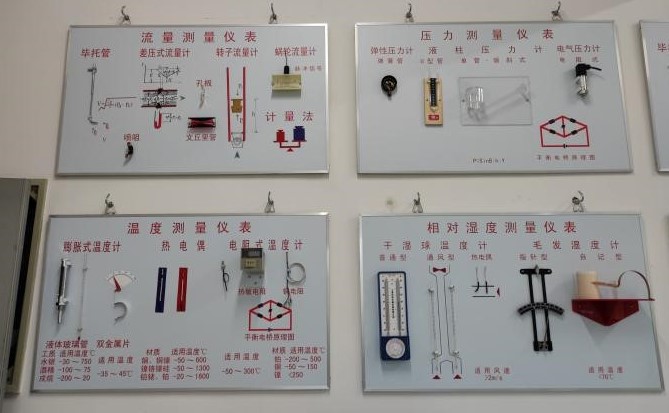 多種熱電偶等實(shí)物或模型組成,并在每類儀表下面畫有材質(zhì)和使用適用溫度范圍的表格和工作原理圖
