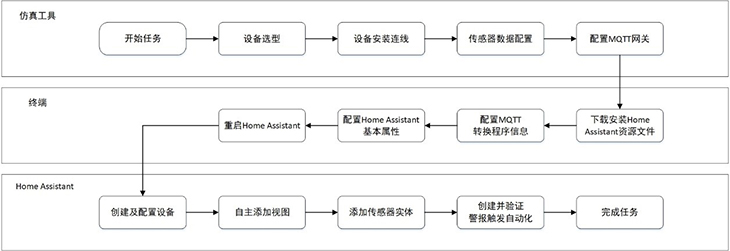 一、 智能家居應(yīng)用系統(tǒng)需求分析 (1)實(shí)時(shí)了解客廳光照值、溫濕度值的變化;實(shí)時(shí)了解臥室的門(mén)磁開(kāi)關(guān)狀態(tài)、人體監(jiān)控;實(shí)時(shí)了解廚房的水浸和煙霧傳感器狀態(tài) (2)實(shí)時(shí)控制警示燈的開(kāi)關(guān) (3)根據(jù)煙霧傳感器和水浸傳感器的感應(yīng)值來(lái)自動(dòng)化開(kāi)關(guān)警示燈 (4)任意添加所需設(shè)備 二、 智能家居應(yīng)用系統(tǒng)方案設(shè)計(jì) (1)智能家居平臺(tái)選擇Home Assistant (2)選擇ZigBee網(wǎng)關(guān)對(duì)接設(shè)備和平臺(tái) 三、 智能家居應(yīng)用系統(tǒng)項(xiàng)目實(shí)施 (1)在仿真設(shè)備平臺(tái)安裝智能家居設(shè)備并配置網(wǎng)關(guān) (2)在虛擬機(jī)中安裝HA相關(guān)軟件 (3)對(duì)HA進(jìn)行初始配置 (4)將設(shè)備圖標(biāo)布局到Home Assistant的平面圖中并顯示設(shè)備數(shù)據(jù) (5)在Home Assistant平臺(tái)上設(shè)計(jì)并實(shí)現(xiàn)自動(dòng)化規(guī)則在仿真設(shè)備平臺(tái)上開(kāi)啟實(shí)驗(yàn)以驗(yàn)證智能家居案例 |