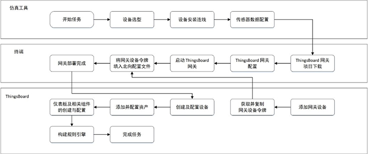 智慧溫室案例,引入了ThingsBoard IoT Gateway開(kāi)源解決方案,在AIoT平臺(tái)的仿真工具中部署ThingsBoard gateway網(wǎng)關(guān),以連接ThingsBoard云平臺(tái),便于上送溫濕度傳感器數(shù)據(jù),搭建恒溫機(jī)執(zhí)行器模塊。基于ThingsBoard平臺(tái),用戶(hù)可在儀表盤(pán)內(nèi)添加設(shè)置智慧溫室場(chǎng)景、溫濕度顯示設(shè)備等組件,獲取仿真實(shí)驗(yàn)中上送的虛擬數(shù)據(jù),以動(dòng)態(tài)曲線的形式作可視化呈現(xiàn);用戶(hù)還可根據(jù)案例要求,在ThingsBoard平臺(tái)的規(guī)則鏈庫(kù)中,自主編輯設(shè)定規(guī)則引擎,實(shí)現(xiàn)智慧溫室的恒溫控制與異常告警。