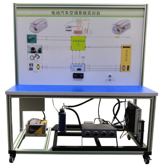 點火開關、電動汽車空調壓縮機、膨脹閥總成、干燥器總成、鼓風機總成、冷凝器、冷卻電子風扇、電動空調壓縮機控制器總成、空調蒸發(fā)箱總成、充電器與充電接口、充電插線、DC-DC轉換器、鋰電池組、空調操作面板、高低壓空調壓力表、采暖模塊總成、電源總開關、急停開關、直流接觸器、輔助蓄電池(12V45AH)、一體化全鋁合金型材搭建的移動臺架(1500×700×1700mm 帶自鎖腳輪裝置,帶安裝檢測端子的原理面板,面板1448×940mm)、故障模擬與排除裝置、設備操作說明書。